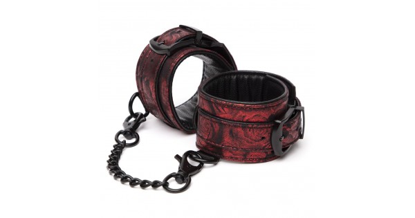 Наручники из кожи с узорами. Наручники имеют кольца для крепления и металлическую сцепку...