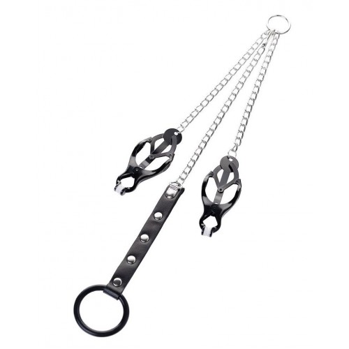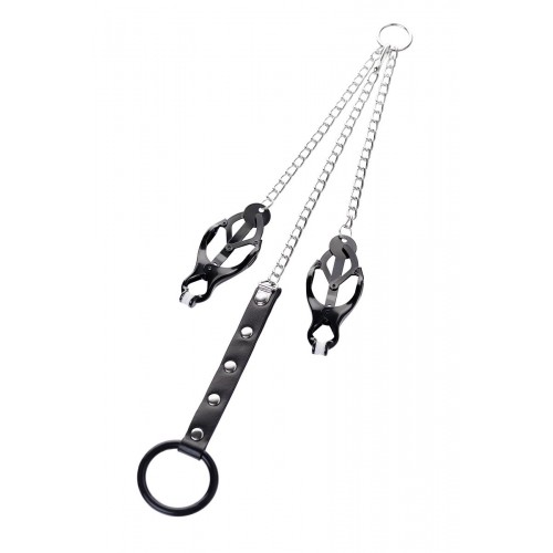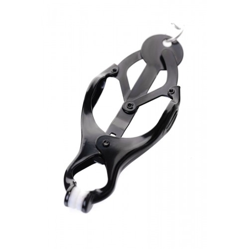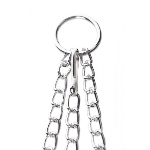 Мужская версия зажимов для воздействия на соски. Конструкция с пружинным механизмов - один из самых жестких вариантов. Дополнительное ограничение свободы обеспечивает мягкое кольцо на пенис. Длина сцепки - 48,5 см.