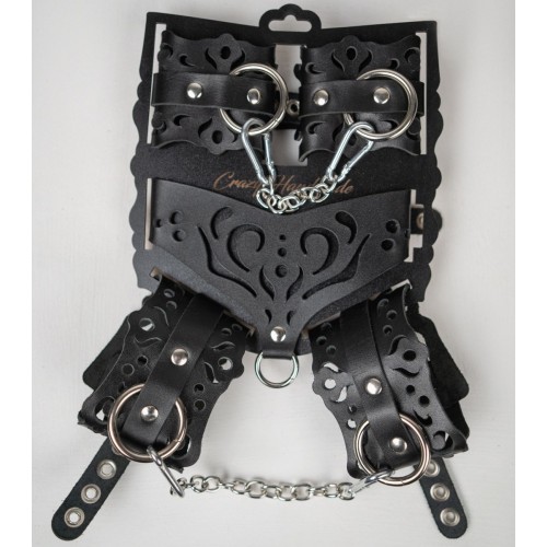В набор входит ошейник, наручники и оковы. Доставляется в фирменной упаковке в виде брендированной деревянной подложки. Ошейник из натуральной кожи треугольной формы с декоративными резными узорами. На нижней части изд... Читать далее...