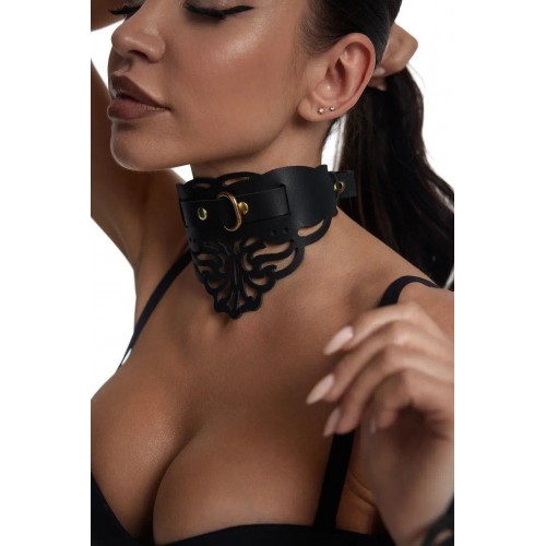 Чокер фигурный из натуральной кожи, украшенный узорами. Каждый элемент дизайна тщательно проработан, чтобы подчеркнуть красоту и элегантность изделия. Золотая фурнитура, сверкающая на фоне черной кожи, добавляет утонченности и изысканности. Доставляется в фирменной упаковке в виде брендированной деревянной подложки.