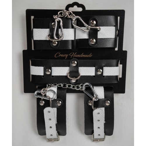 Наручники состоят из двух деталей: основа прямоугольной формы из натуральной кожи черного цвета и ремешок белого цвета с прочной хромированной фурнитурой в виде овального кольца. Расположение ремешка через прорези основной части является декоративным решением, а также служит для лучшей регулировки размера. В комплект входит соединительная цепочка с двумя карабинами.