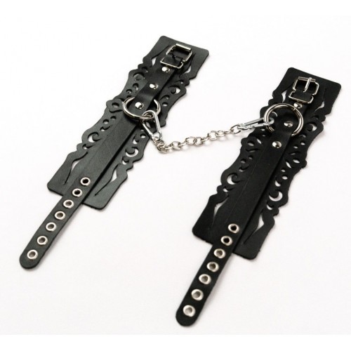 Кожаные узорчатые оковы имеют регулируемые ремешки. Оковы снабжены металлическими кольцами и сцепкой.