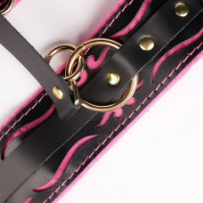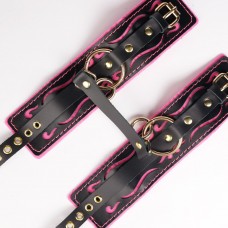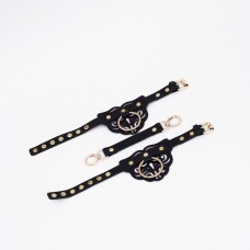 Кожаные оковы с контрастным декором и заклепками имеют кольца для крепления и металлическую сцепку...