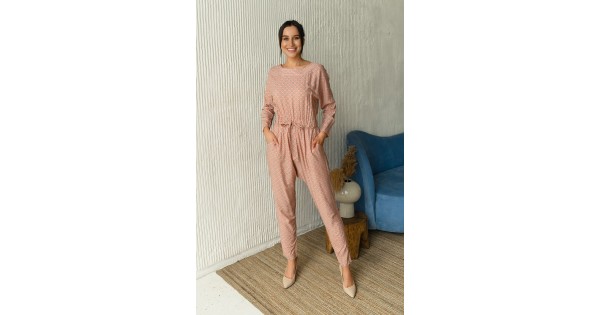 Комбинезон брючный, приталенный с карманами, из принтованной вискозы. Крой рукава летучая мышь, зауж..