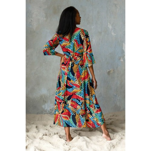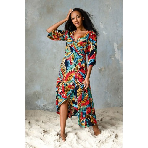 Платье выполнено из яркой принтованной вискозы. Модель приталенного силуэта на запах длиной макси. Платье с V-образным вырезом горловины. Рукав свободного силуэта длиной 3/4.