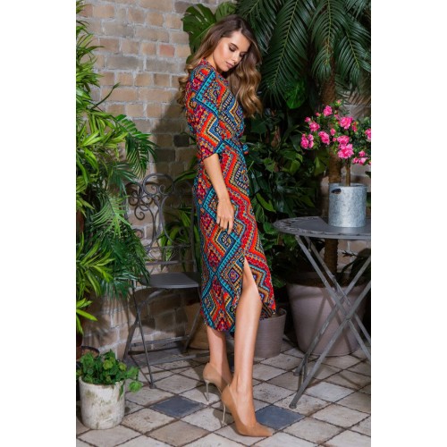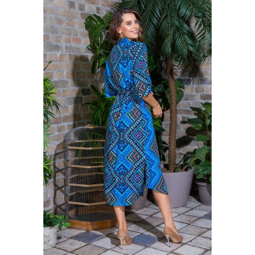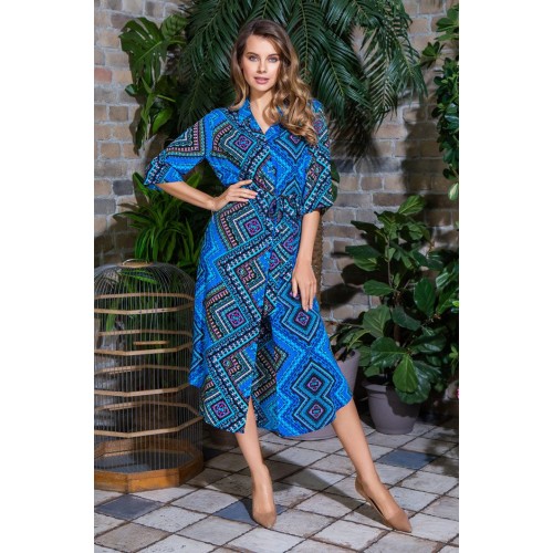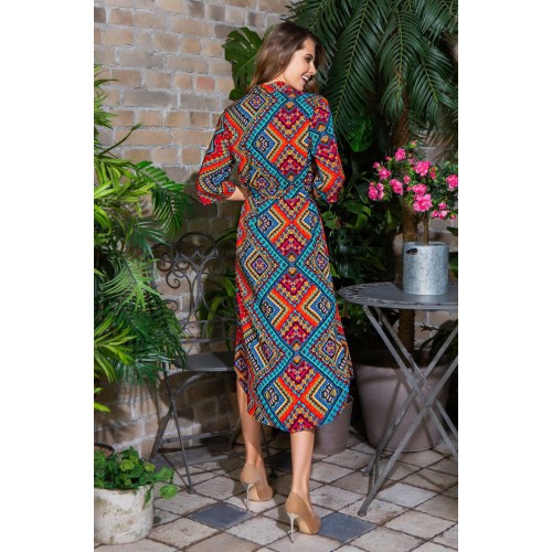 Платье-рубашка выполнено из принтованной вискозы. Модель на поясе свободного силуэта длины миди. Платье рубашечного типа с воротником стойкой и планкой застежкой на пуговицах. Рукав прямой длиной 3/4.