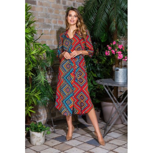 Платье-рубашка выполнено из принтованной вискозы. Модель на поясе свободного силуэта длины миди. Платье рубашечного типа с воротником стойкой и планкой застежкой на пуговицах. Рукав прямой длиной 3/4.... Читать далее...