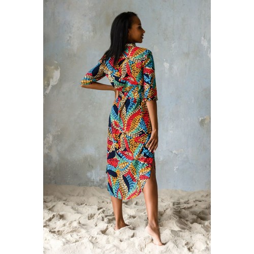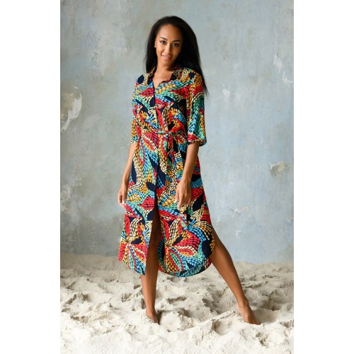 Платье-туника выполнено из яркой принтованной вискозы. Модель на поясе прямого силуэта длины миди. Туника рубашечного типа с воротником стойкой и планкой застежкой на пуговицах. Рукав прямой длиной 3/4.