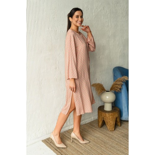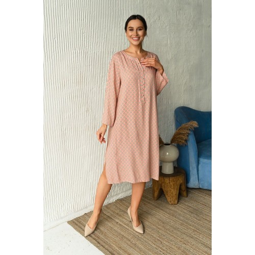 Длинная туника прямого силуэта с круглым вырезом горловины на полочке и спинке из принтованной вискозы. Модель с втачными широкими рукавами. Круглый вырез горловины полочки и спинки обработан притачной фигурной обтачкой. V-образный разрез на горловине полочки обработан притачной планкой. Планка туники застегивается на петли и обтяжные пуговицы из основной ткани.