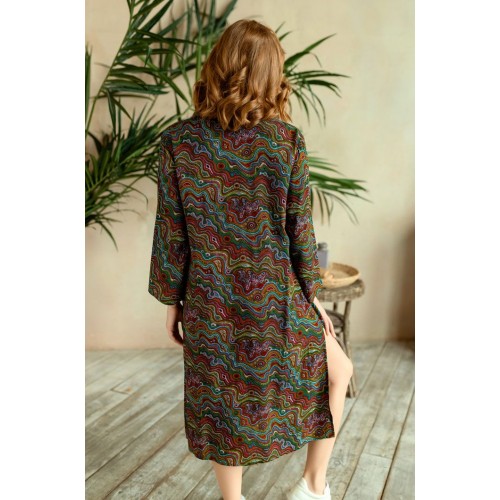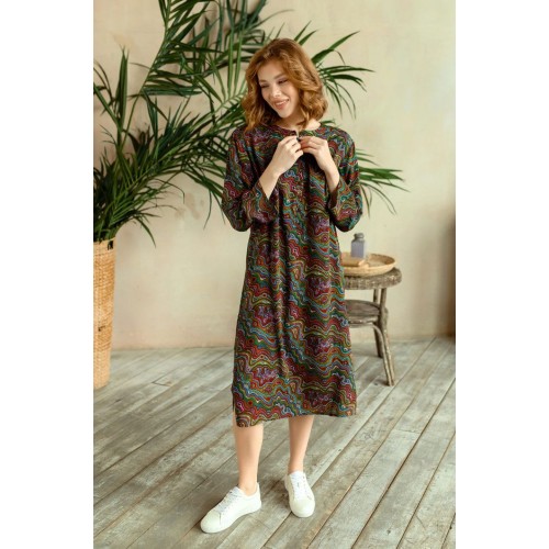 Длинная туника прямого силуэта с круглым вырезом горловины на полочке и спинке из принтованной вискозы. Модель с втачными широкими рукавами. Круглый вырез горловины полочки и спинки обработан притачной фигурной обтачкой. V-образный разрез на горловине полочки обработан притачной планкой. Планка туники застегивается на петли и обтяжные пуговицы из основной ткани.