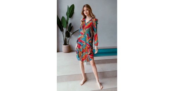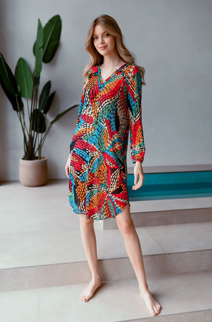 Туника пляжная женская выполнена из эластичной сетки с ярким принтом. Модель длиной миди с длинным р..