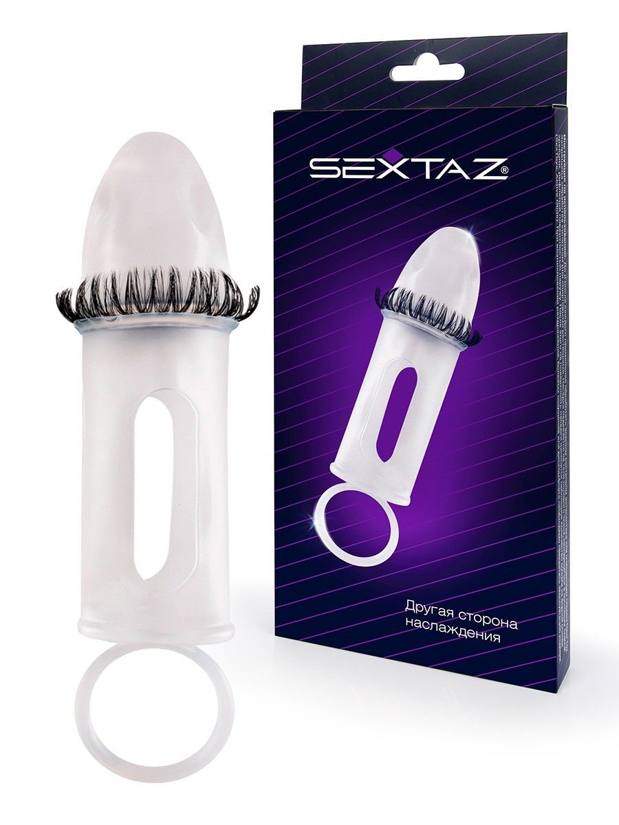 Оригинальная насадка на пенис с эрекционным кольцом для мошонки и возбуждающими «ресничками» внесёт ..