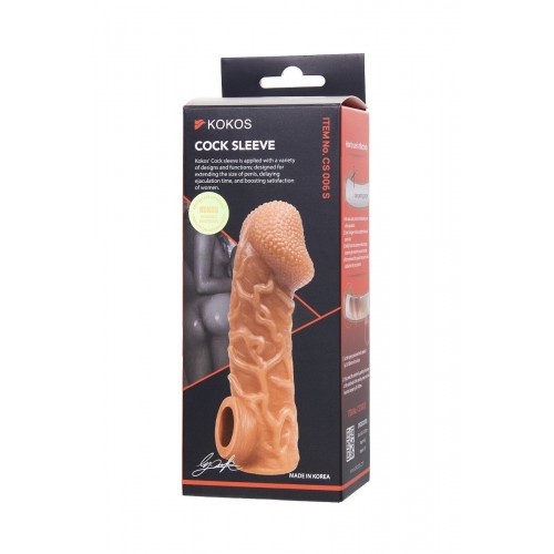 Увеличивающая насадка с фантазийным рельефом в виде вен и пупырышек от KOKOS открывает новые возможности для взаимного удовольствия и воплощает фантазии о внушительном размере пениса.