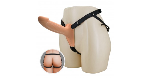 Телесный фаллопротез на черных эластичных ремнях 7 Inch Hollow Strap On. Пояс растягивается до 100 с..